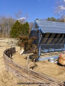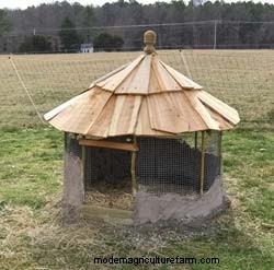 Some of the facilities I have made for our turkeys include a “hobbit house dust bath,” “the Blue Roost,” the “Pentagon Nursery,” a 6″ PVC pipe feeder with covered top (for keeping mice out at night), and a bamboo woven wattle wind barrier fence. I’ve also made bentwood trellises for day-time perching and recycled a large rabbit cage for a temporary holding house for up to six birds.