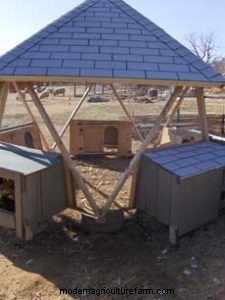 The Blue Roost has a sloping north roof that comes right to the ground and protects them from the north wind and rain. It is open (with hardware cloth) on the south, east and west sides, so they feel outside, which they prefer. There are two doors: one person sized, the other turkey sized. There are plenty of horizontal perches. It is about 10′ x 20′.The new Pentagon Nursery from Stromberg’s starplates allow poults to seek warmth from any nesting hen. All hens raise the young together for better flock bonding and survivability. There are sliding doors, on the inside and outside, for each of the five nest boxes. Once a hen goes broody, the outside door can be closed and any early hatching poult can explore the central (and safe) nursery. Starplates are steel plates, with channels to hold 2×2’s, 2×3’s or 2×4’s. You drill holes in the struts and bolt them into the starplates to build a solid, mini-dome framework.