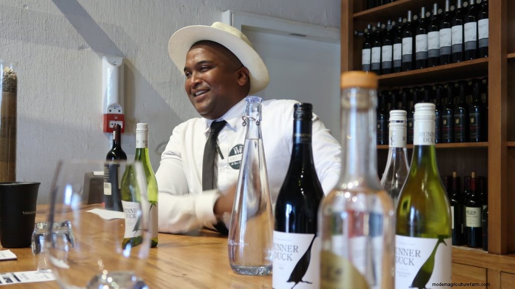 Shell walks me across a grass yard to the cellar kitchen. We meet a charismatic sommelier, who introduces me to the first of my six wine glasses. Shortly after, Louis Horn the farm manager, in charge of vineyards, animal husbandry, gardens, and ducks, joins us. With my third wine sample in hand, we tour the ducks sleeping quarters or afdak which is Afrikaans for shelter.
