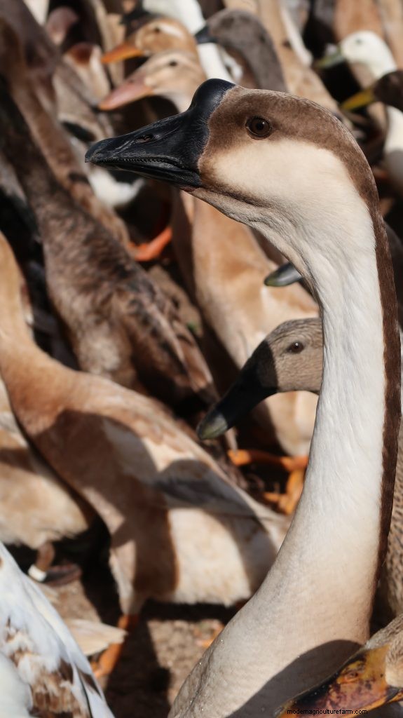 The 100 or so geese join in the duck parade and act as security in the breeding runner duck pens. This year they are breeding 132 birds out of the 1800 runner ducks with hopes of adding 300 new birds to the program. A new Adopt-a-Duck program allows South Africans to adopt older ducks ready to retire.