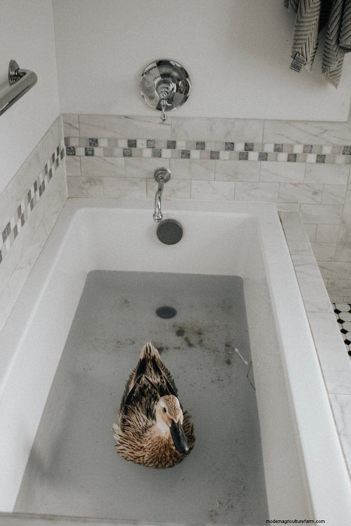 I shakily gathered the tools I would need and a pair of latex gloves. I had never before even vaccinated a horse let alone a small bird. I was nervous but knew that Chamomile was in pain and needed my help. I would remove the fluid and then try to address the underlying health issue thereafter. I brought Chamomile into my bathroom and cleaned her up. I snuggled her in my left arm like a football, her tail side to the mirror. I was told to insert the needle on the right side of the body, as this is where no major organs reside within the duck. “Right side and sort of low, so that it can drain more slowly over time, before the hole seals up again,” Janet coached. I took a breath and inserted the needle.