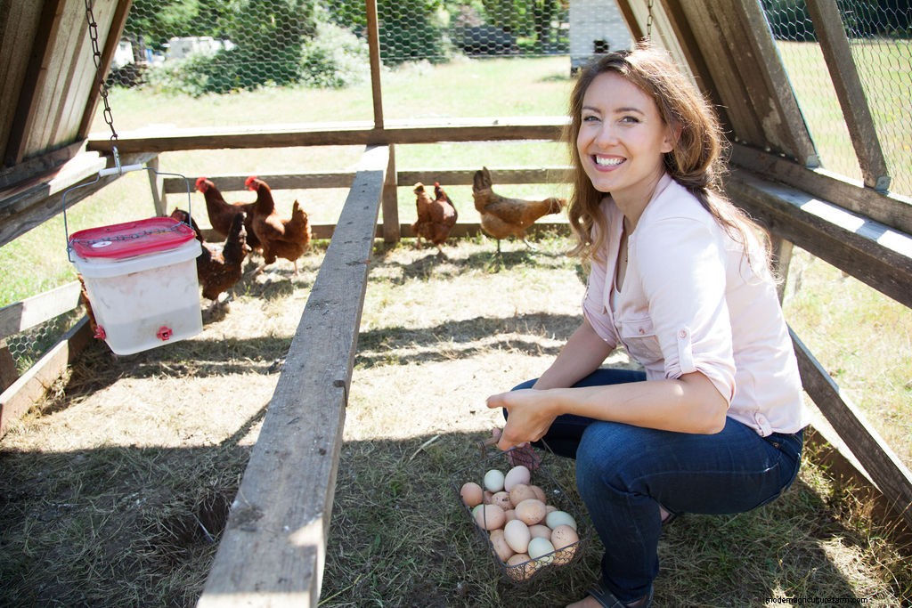 My favorite hack for raising happy healthy chickens is to raise them in a moveable coop. Chickens love to eat grass and insects. Allowing your chickens to eat grass and insects keeps them from getting bored and makes for tastier eggs. The yolks get so orange when they can forage. The other benefit is that they will fertilize your lawn for you while they are eating your insects and making the best eggs.