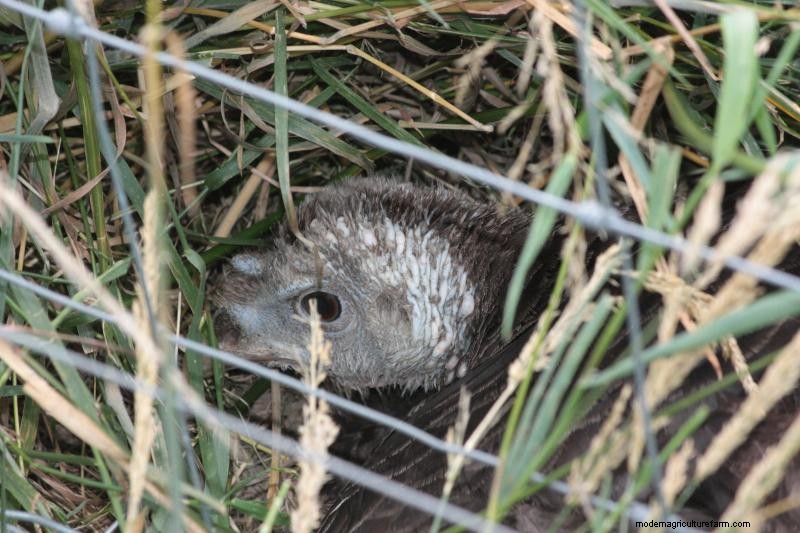 Description: Red head and neck (changeable to bluish-white), dark eyes and black beak. The plumage is dense metallic black with a green luster. Poults have creamy-white head coloring and may have some white or bronze feathers, although these change as they molt. Shanks and toes may be initially black but change to pink as they mature.