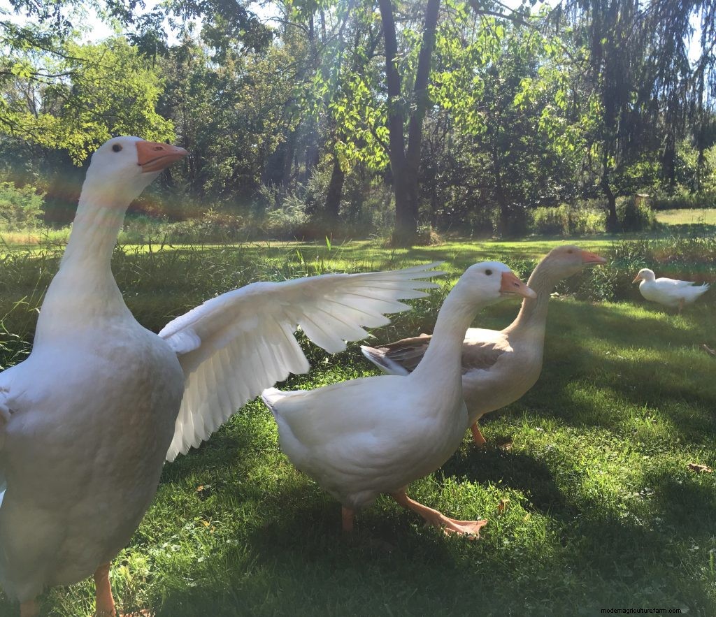 Just as with ducks, geese do require deep water buckets to allow them to dip their nostrils or nares into water for clearing. Geese deter small predators such as hawks and raccoons so there is more leniency with their housing but ideally, they are fully enclosed at night away from coyote and fox, in a structure which is deep enough to keep the wind out and with a solid roof to keep the birds dry if they choose. A-frame houses are a popular choice when raising geese to encourage nesting habits. Whether raising geese for meat, eggs, or guardianship, many farmers allow their geese to free range by day since they deter small predators and can sound their alarms, alerting the farmer to help, for larger ones. Enclosed runs are less popular for geese.