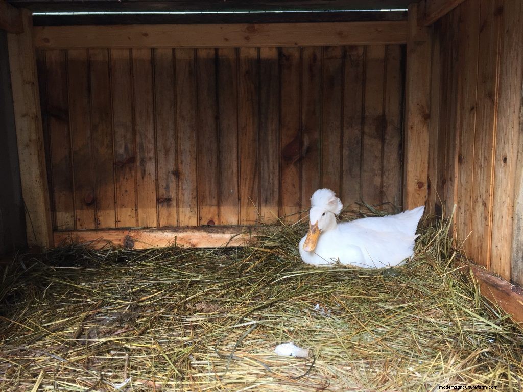 Ducks do not fly vertically to lay their eggs in nesting boxes. They will use a nesting box if it’s placed at a low level in proximity to the ground. However, they much prefer to follow their natural instinct to form nests of bedding and to lay their eggs on the floor. Some ducks simply lay wherever they happen to be at the moment and avoid nest building altogether. Though some hens prefer privacy, many are just as happy to lay their eggs in a public location. Additionally, ducks enjoy sleeping in their nests until they are let out of the coop for the day or directly on the floor.