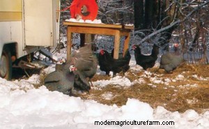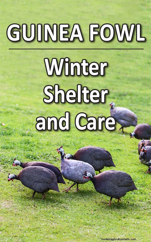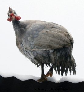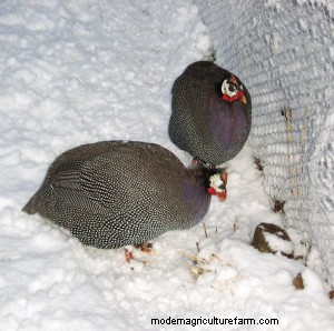 Although the common helmeted guinea fowl originate from Africa, they are pretty tough birds and do not require a heated coop. Some owners do prefer to give their birds the option of getting under a heat lamp when temperatures drop to the single digits. If you choose to do the same, make absolutely certain that the light is securely fastened high off the bedding material and that both the light bulb and your guineas are protected by a shield. f the guinea house is large enough, it can be partitioned with a room for food storage and a brooder and with storage areas for bedding and hay or straw. The storage area can come in handy should the size of your flock increase and additional housing space be Yes, guinea fowl do like to get out for some exercise and fresh air even in the winter. On a snowy, but calm day when there are no weather warnings or hazardous conditions, let them out! Prepare to help first-timers back into the henhouse at night. Some may freak out at their first snow, but as you can see in the pictures, they will get used to it, walk on it, and enjoy finding many seeds and such along fence rows and on the undersides of grasses that protrude through the snow. An attached poultry yard can be covered in the winter and an occasional flake from a bale of alfalfa hay will provide needed. some greens and tiny insects to peck at while outdoors getting some fresh air and sunshine.