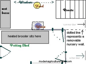 Ventilation helps to allow moisture as well as fumes from ammonia and odors to escape through vents in the eaves or through exhaust fans installed in the roof or by windows that can be opened slightly—taking care that the air exchange does not create drafts in the roosting area. All openings should be covered securely with quarter inch welded wire fencing to keep rats, mice, mink, snakes and other small predators out. Double wood walls (without insulation) will help hold in some heat. Insulating an unheated building can actually hold moisture in. Dampness can cause respiratory problems and increase the risk of disease. Parasites can multiply rapidly in damp bedding. Remove any bedding that gets wet from water spills and keep the bedding as dry as possible.