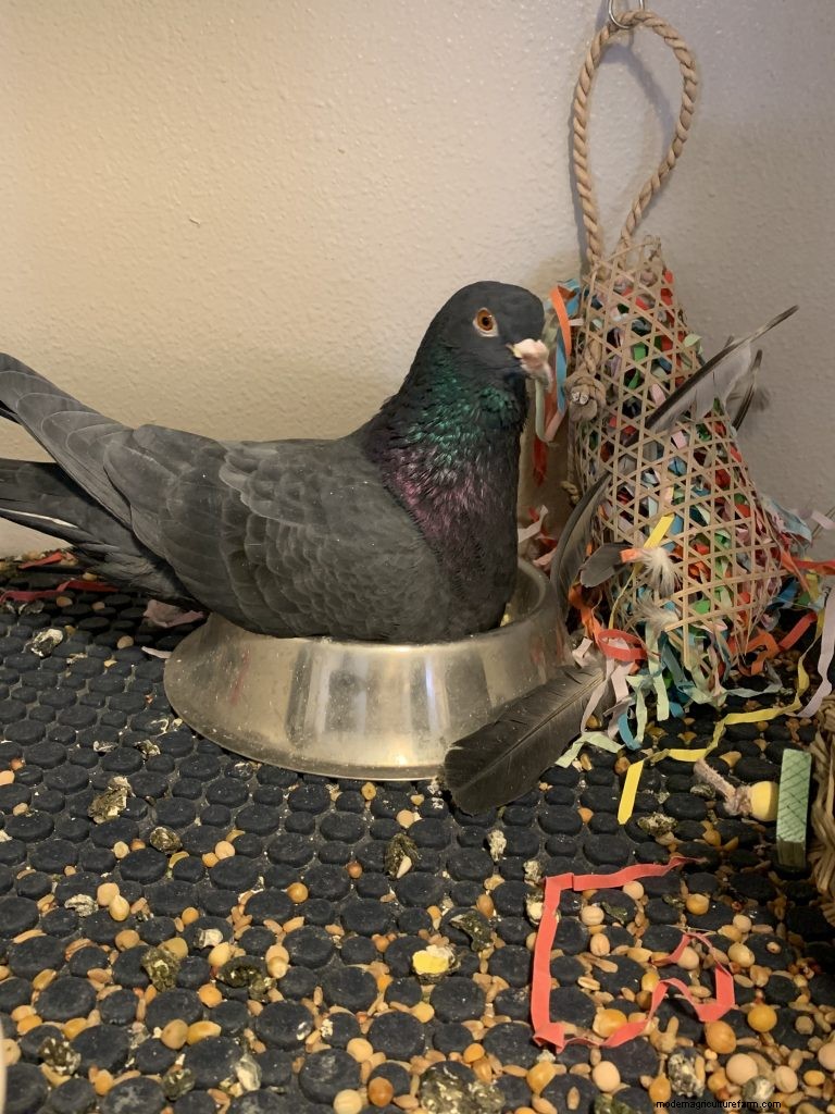 “Kind of a unique bird, she was laid by a hen, hatched by a pigeon, and raised by humans,” Jett told me. He put another egg under Squirt to help with the loss of his chick, but that egg never hatched.