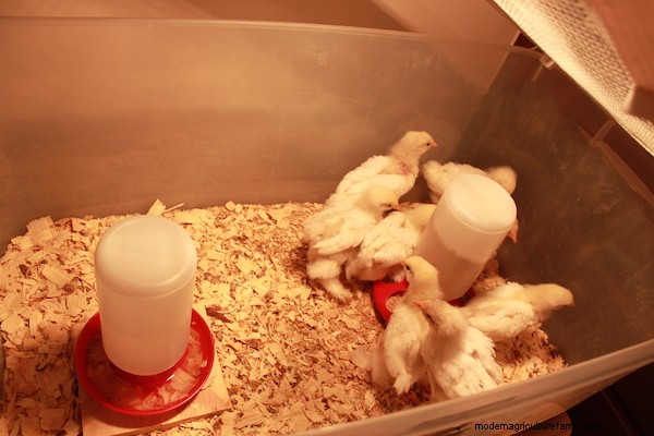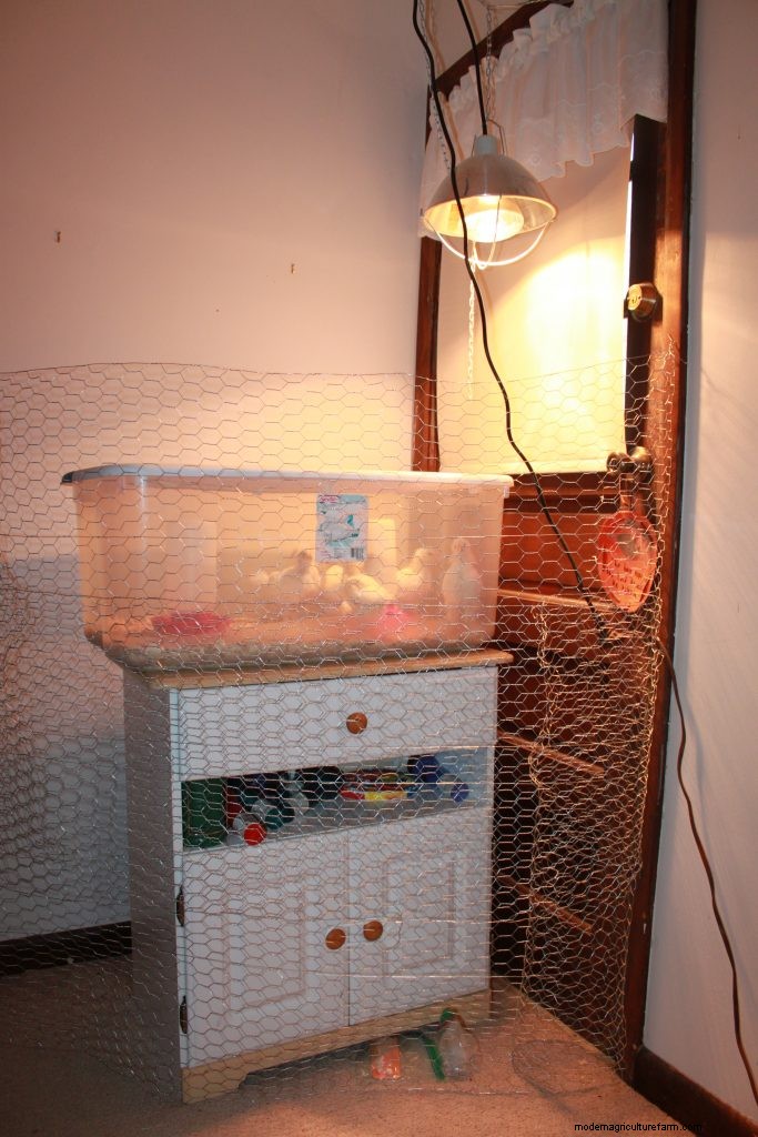 Finally, after attaching another portion of wire just above it, the formidable fortress reached above the top of the brooder. Taking a step back, I observed with a heavy sigh the profound mess I had made. It was hideous, to be sure, but at least I was confident that it would keep the cats away … and indeed it did.