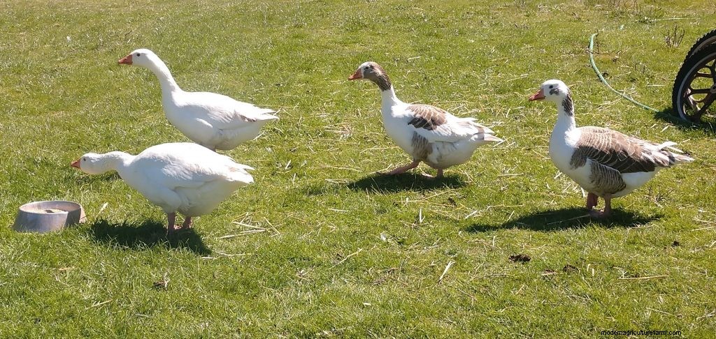 He supplements their foraging with a high-protein mash. He tells me that they do a great job at keeping about 100 x 100 feet of grass in check.