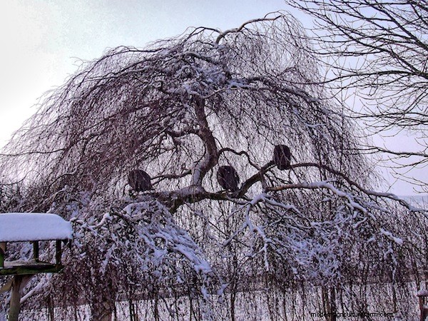 “I did try bringing the birds into the carport one cold January,” says Roy, feeling that the cold couldn’t be good for their health. “They went in the shelter for food but refused to stay there overnight, always retreating to their favorite tree as dusk fell.”