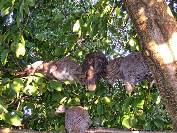 Keeping guinea fowl safe is an important step when adding them to your flock. One night when we were camping on Roy’s land, we were awoken at 4 a.m. by loud squawks of guinea fowl, coming from the tree where they sleep. This terrible noise went on for about 20 minutes! In the morning, Roy said the guinea fowl might have been spooked by a fox. These birds are renowned for their noisiness. Roy finds it endearing; we’re not sure what the neighbors think! Generally, they’re not considered to be a good choice if you have close neighbors.