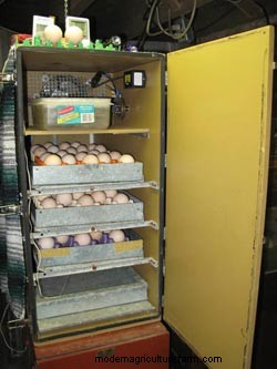 The preparations mentioned earlier should be done far enough ahead of time to allow for the proper adjustments to be made before it is time to set the eggs. The last thing that I do before I set the first egg is to clean and fumigate the incubator. This ensures that the incubator is free of harmful bacteria which can contaminate the eggs. The use of a separate hatcher will greatly reduce the chances of bacteria forming in the incubator because all the mess and fluff associated with the eggs hatching is confined to the hatcher. The hatcher should be located in an area where it can be cleaned regularly to minimize the bacteria build up in it.