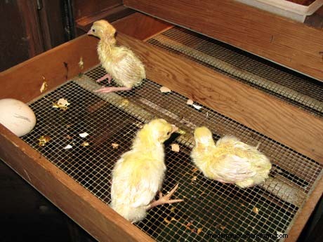 I set my eggs in the incubator daily and I never hold eggs more than seven days before setting them. If the eggs are to be held a few days before incubation begins, they should be kept at 55-60ºF in a dry location and the eggs should be turned twice daily. During the incubation season, I candle the eggs once a week to check for fertility. If an egg shows no signs of development after 10 days of incubation, it should be removed so that it doesn’t spoil and possibly contaminate the other eggs in the incubator. I leave the fertile eggs in the incubator until the 26th day of incubation. The eggs are then moved to the hatcher where they will usually hatch within two to three days. The eggs are no longer turned while they are in the hatcher so that the chick can properly orient itself for hatching. The hatcher is run at the same temperature as the incubator but with a higher humidity level. This can be done by adding an extra water pan. The higher humidity helps prevent the membranes in the egg from drying out too much while the chick is hatching. Once the chick has hatched, it will stay in the hatcher for about a day or until it can stand on its own and move about easily.