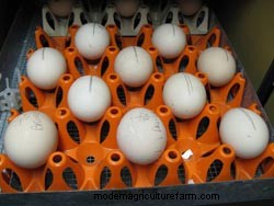 Now that the incubator is ready, it is time to set the eggs. I lay the peahen eggs on their sides in the incubating trays with the pointed end of the egg tipped slightly down. The eggs are marked on one side with the date that the egg was set, and a line is marked 180º from the date on the other side of the egg. Always use a pencil or crayon to mark the eggs. Never use a permanent marker because it can kill the embryo. My incubators have automatic turners which tip 45ºF in either direction every 2-3 hours. I have found that the hatching percentage can be greatly improved by turning the eggs over 180ºF twice a day in addition to using the automatic turner. This is where the egg set date and the line marked on the egg come into play.