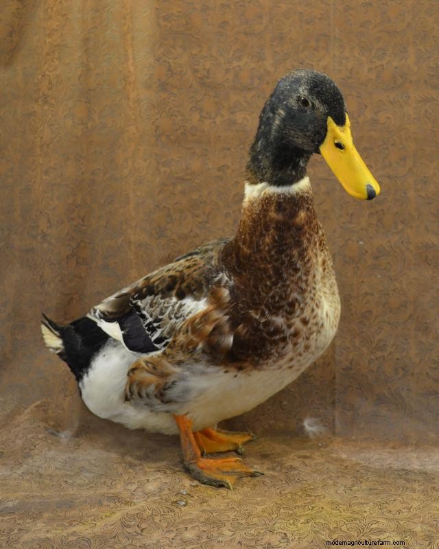 Description: Stocky, broad, compact body with slightly erect posture. The coloring is basically Mallard, except that they express two dominant restricted genes and two recessive light genes, which limit pigment on the face and body, resulting in a silvered effect.