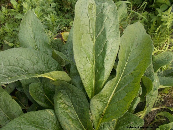 Comfrey (Symphytum officinale) is a fast-growing perennial herb in the borage family with large, bristly leaves.