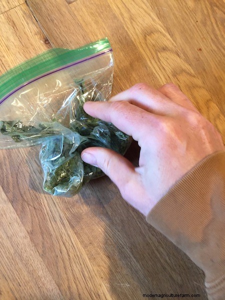 Crumble your dried leaves with your hands, in a mortar and pestle, or by putting them in a baggie and crushing them.