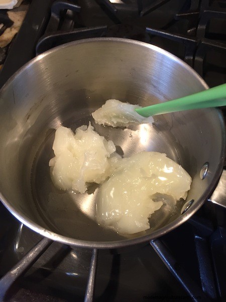 Once you have your dried comfrey, you’ll need to melt one cup of Vaseline in a small pan over low heat. It melts fairly quickly even at a very low heat.