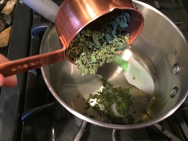 Add a half cup of the crumbled, dried leaves (or if you’re using root, add two tablespoons). Stir and let the mixture cook over very low heat for about 20 minutes.