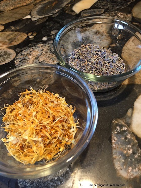 Try this variation, especially if you’re making a batch for your own use. Melt one cup of Vaseline. Stir in one tablespoon each of dried calendula petals, dried lavender buds, and dried comfrey leaves.