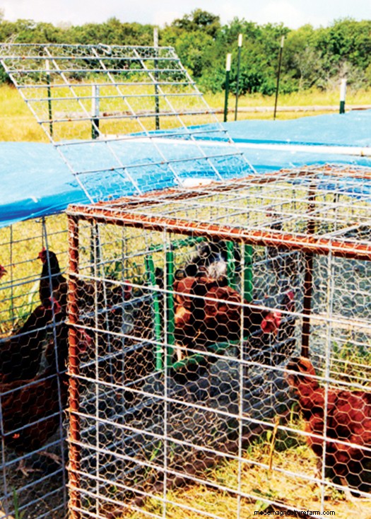 I was able to accomplish these goals by building a comfortable chicken house that is well insulated, well ventilated and large enough for a small flock. I have 18 Rhode Island Red hens and one mixed breed exotic rooster named Burt. The chicken house measures 16′ long x 6′ wide and 8′ high, large enough for me to service the facility. I then erected a run 5′ wide x 112′ long perpendicular to the chicken house and securely attached to it. The run is framed with hog panels and completely covered with chicken wire. In addition, for added security, a 2′ wide apron of hardware cloth runs parallel to the run on the ground to keep critters from digging underneath the fence. Hardware cloth is installed at the bottom of the chicken house as well to keep critters from taking up residence underneath. I have laid 6′ x 8′ tarps on top of the run to keep the hot Texas sun off the chickens.