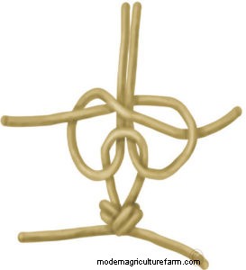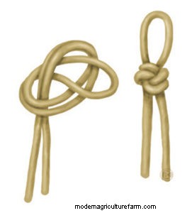 Fold the cord in half and tie a knot near the fold, creating a small loop at the end. Tie a second knot about 4-1/2 inches from the first knot for a large breed, 3 inches away for a bantam. Again, the exact distance between the knots will depend on the size of the bird’s wing.