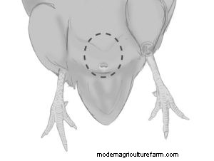 When you have trimmed about one inch of fluff all around the vent, trim a little farther away on the tail side of the hen’s vent and on the belly side of the cock’s vent. Cut these feathers not quite as short as those closer to the vent.
