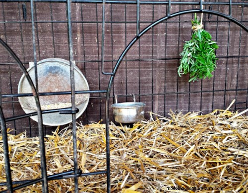 Fortunately, we have lots of dog crates and other small cages. I paired and tripled up the chickens (putting buddies with buddies) and then put the cages in the back of our horse trailer for the trip, with a nice thick layer of straw on the bottom of each cage, and a small hanging feeder and waterer in each cage. Being in a smaller space leaves less chance of the birds being jostled, or falling and injuring a leg or foot. Don’t cram them in, be sure everyone has room to flap their wings and move around a bit, but in general, the smaller the space the better.