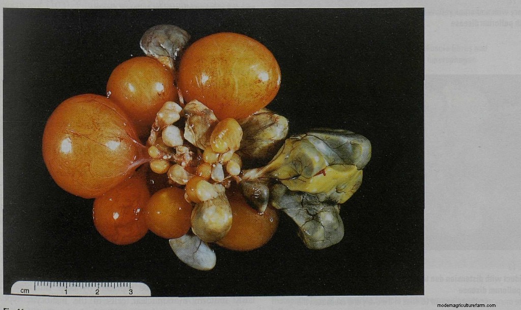 Postmortem examinations reveal lesions for both diseases. Pullorum consistently affects the ovary, but almost every organ can develop lesions. Lesions are indistinguishable between the two diseases.