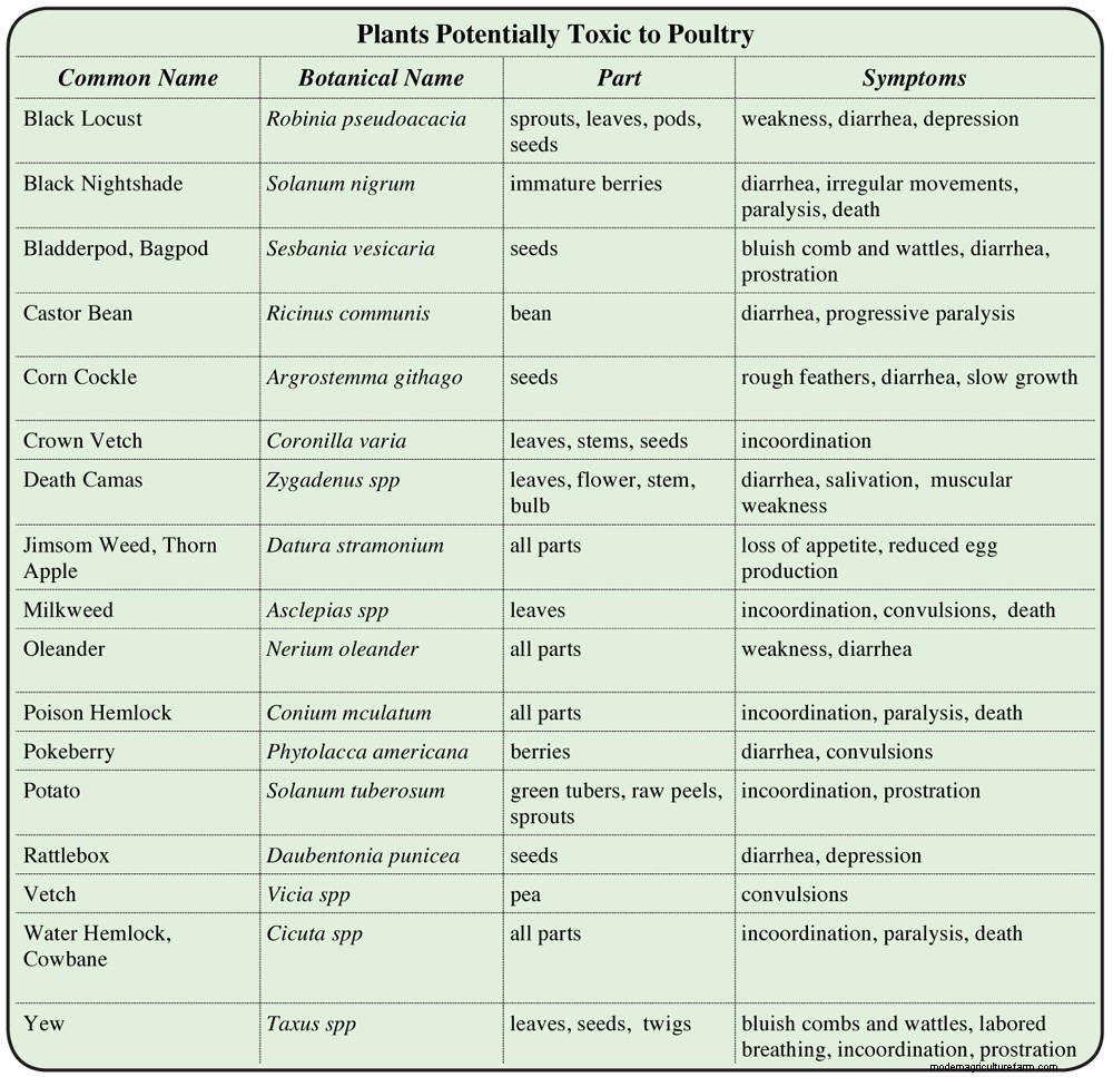 Some weeds found in pasture can be toxic, but should not be a problem if your flock has plenty else to eat. Most toxic plants don’t taste good and therefore are not tempting to eat, except to a starving bird. Since birds nibble here and there to get a variety in their diet, if they do get a bite or two of a toxic leaf or seed, it’s unlikely to create a problem. Then, too, whether or not a specific plant is toxic may vary with its stage of maturity, growing conditions (such as drought), and other environmental factors. Even if a bird does get a potentially toxic dose, the effect depends on the bird’s age and state of health. The accompanying table lists common plants that potentially pose a danger. Some mushrooms are toxic, as well, but mushrooms would have a hard time getting a foothold where poultry are active.