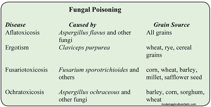Fungal poisoning can be the result of by-products generated in moldy feed. A number of poisons, or mycotoxins, are produced by molds that grow naturally in grains, and some molds generate more than one kind of poison.