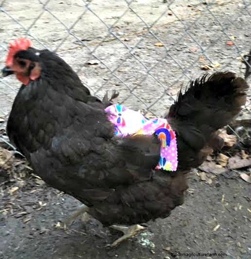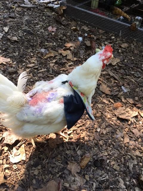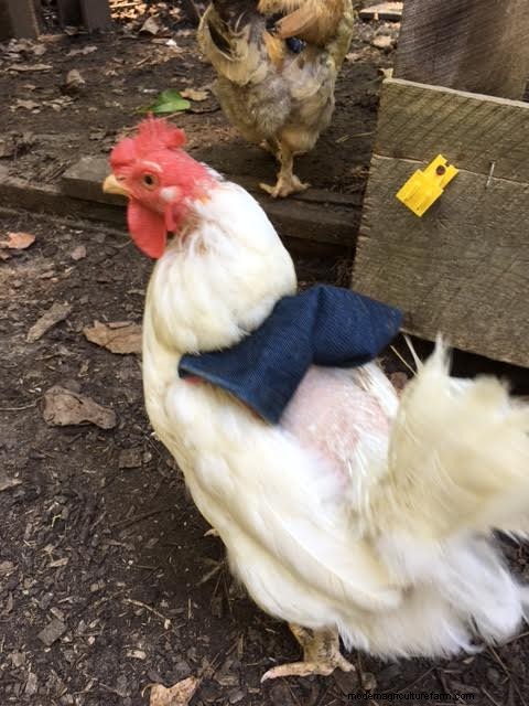 One way to help a hen protect her back is to have her wear a hen saddle. Also called an apron or jacket, the hen saddle is worn over the hen’s back, with elastic straps around the wings to hold it in place. In some patterns, a strap goes around the neck, also. Hen saddles are not intended to be worn year round. Use them as needed to protect the hens before the damage occurs or until the skin heals and feathers have regrown.