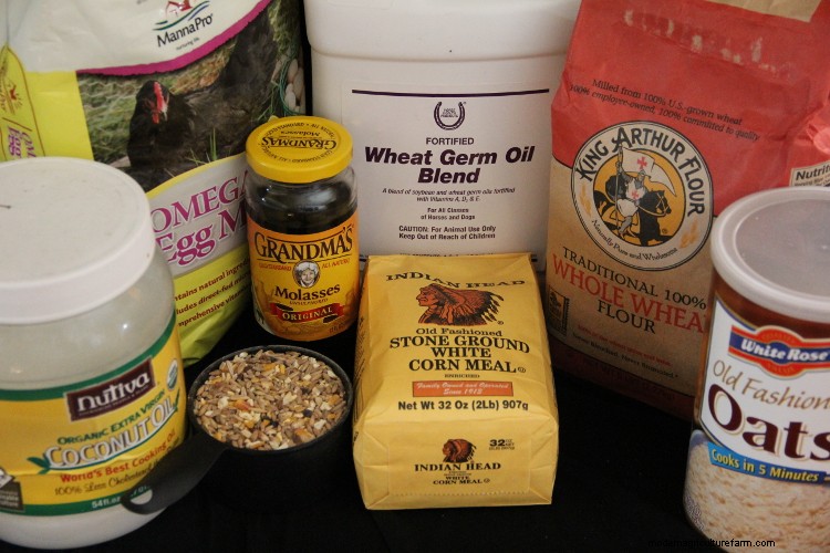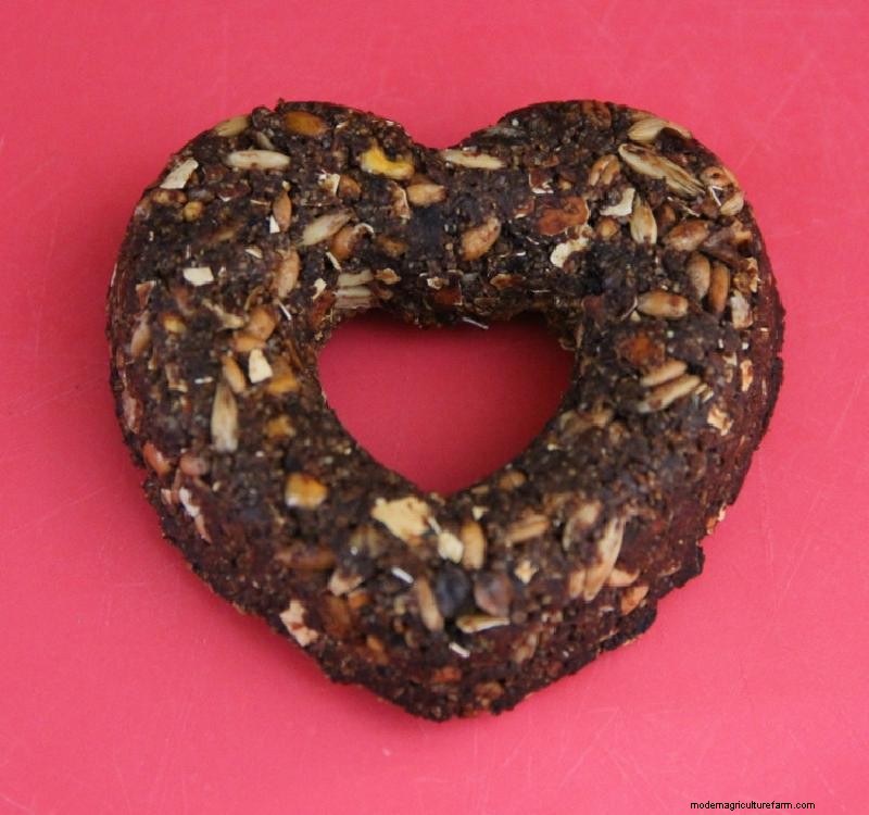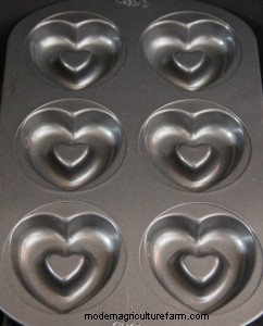 So, I adapted my flock block chicken treat recipe for an indoor application. We have seven cages of birds, so I needed at least seven separate treats. I looked through my (mildly obsessive) collection of cookware and settled on a heart-shaped donut pan. What better way to send my flock a Valentine’s Day gift they will actually like!