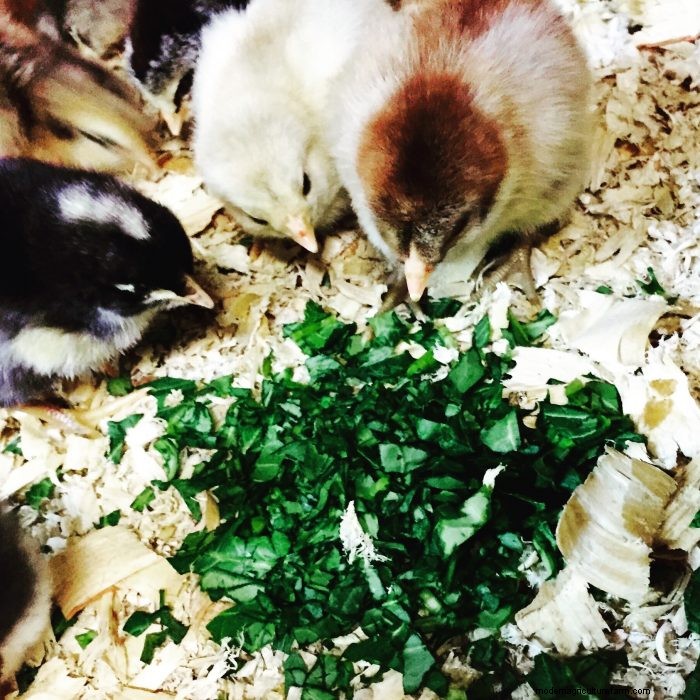 Greens from your yard can also serve as veggie treat for baby chicks. Dandelion greens, clover and grass clippings have all been favorites here. Be sure not to feed these to your flock if you use chemicals to treat your lawn.