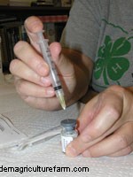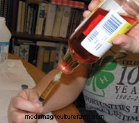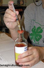 Step 5: Remove the syringe from the vaccine vial, and insert it into the dilutant bottle. Push the plunger down so that the contents of the syringe (with the now dissolved vaccine) are released into the dilutant bottle. Gently swirl the dilutant bottle so that the vaccine is evenly distributed. Now you’re ready to use the vaccine.