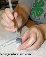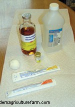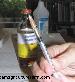 Step 6: Place a layer of paper towel into the bottom of two boxes. Put all the un-vaccinated chicks into one box (the other box is to put them in once you vaccinate them, so you’ll know which ones have been done.) Take a small syringe (the 1 ml ones that diabetics use are perfect for this.) Fill it with 0.2 ml (two tenths) of the vaccine mixture (which is now in the dilutant bottle.)