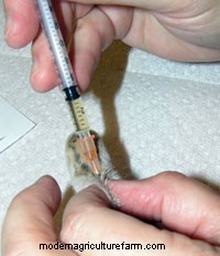 Step 8: Gently inject the vaccine into the fold of skin. You will feel a small bump growing under the bird’s skin as the vaccine goes in. If you insert the needle too far or not far enough, you will feel your fingers get wet, and you will have to start over with that one.