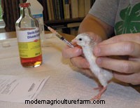 This vaccination is subcutaneous. That means under the skin. You do not want to put the vaccine into the muscles or veins of the chick.