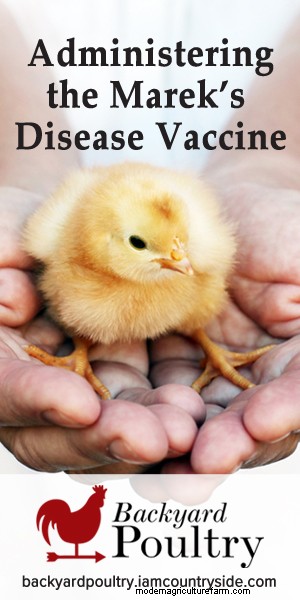 By Laura Haagerty — Do you know the proper way to administer the Marek’s disease vaccine to your chicks? Marek’s disease is very prevalent everywhere there is poultry, and if your chickens catch it there is no cure. Once the sick chicken symptoms are apparent, it’s too late. If you order your chicks from a hatchery, the Marek’s vaccine is usually administered to chickens at the hatchery. Of course, it is easiest to order chicks already vaccinated, but if you are hatching your own birds, or didn’t order pre-vaccinated chicks, vaccinating chicks is not hard once you get the hang of it, and worth doing to prevent losses in your flocks of backyard chickens.