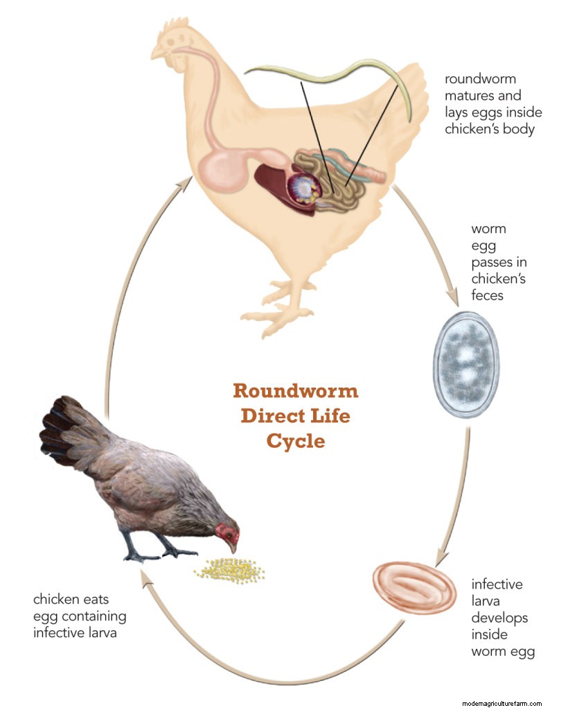 Life Cycles of Worms That Parasitize Chickens The life cycles of parasitic worms involve three basic stages: adult, egg, and larva. For worm species that mature and sexually reproduce inside a chicken’s body, the chicken is considered to be the natural host. But chickens are not the only natural hosts for most worm species that affect backyard flocks. The large roundworm, or ascarid, for example, also infects turkeys, ducks, and geese.
