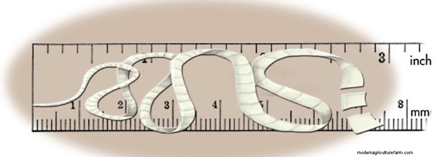 A tapeworm’s body is made up of individual segments, each of which has both male and female reproductive organs. As the segments farthest from the head mature, they become wider and fill with eggs until they break away and are passed in chicken poop. You might see segments, each containing hundreds of eggs, in droppings or clinging to the chicken’s vent area.