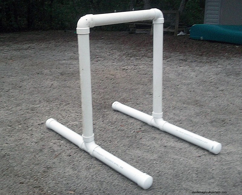 1. The top picture illustrates how I created the frame using 3-inch Schedule 40 PVC. I also needed two T intersections, two 90-degree elbows, and four end caps. This makes the basic frame.