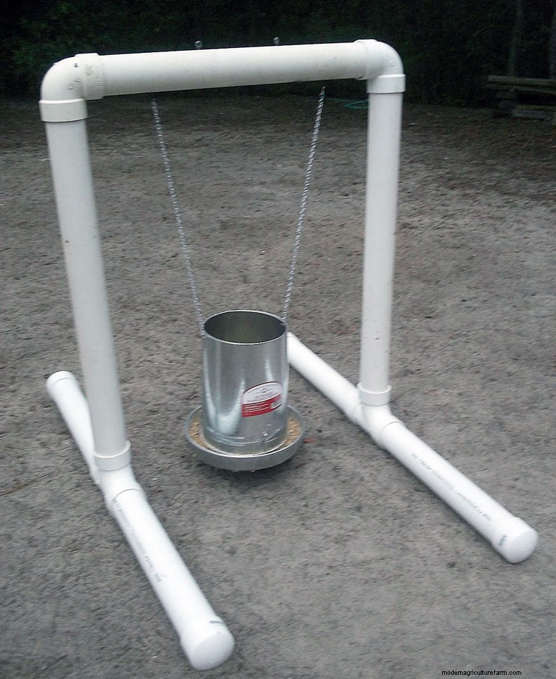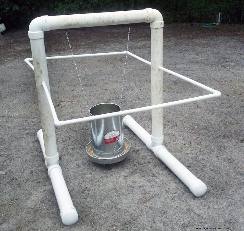 By Ron Eaglin, Florida — I was having a problem with the chicken feed that we keep in the free-range yard getting wet and turning into oatmeal, so I decided to build a stay-dry chicken feeder. PVC was one material I had left over from other projects, so I was also going to use this all up. I also have a spare hanging feeder — so that was also going to get used. The pictures are self-explanatory. I’ll let them do the talking.