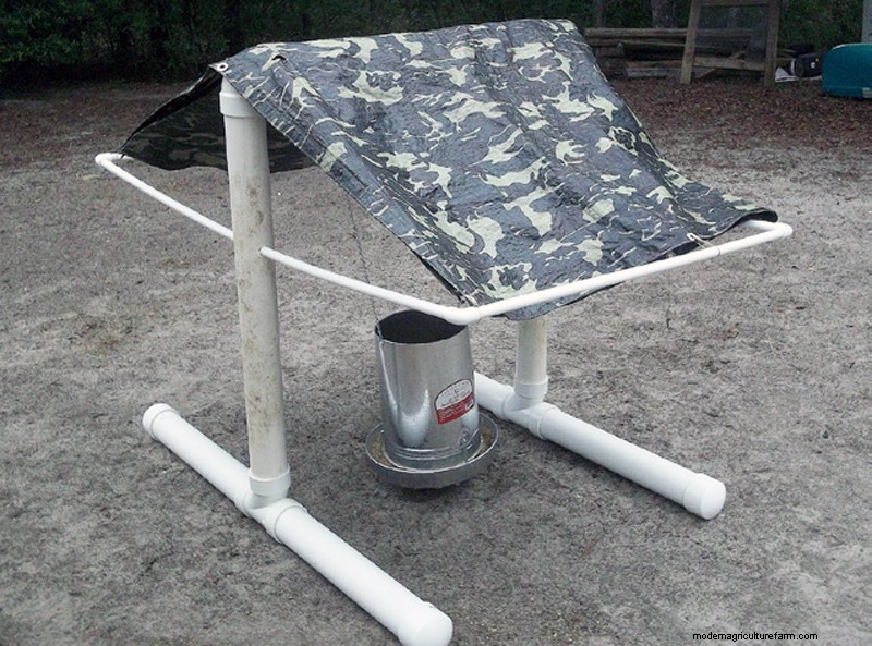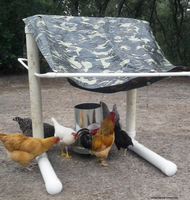 5. I then put a simple tarp over the frame and used string to tie it to the PVC. This is the nice rain cover that has done well to keep the food dry. An added benefit is that it keeps the flock from hanging around on top of the feeder and fouling the feed.