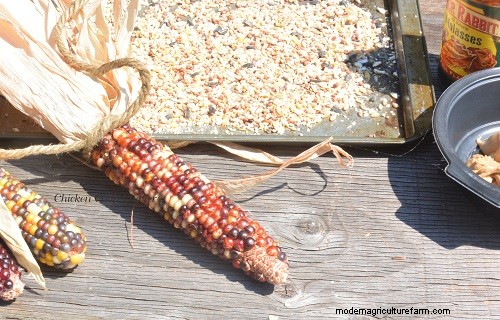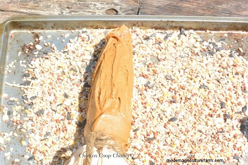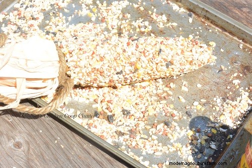 There’s really no need to measure the ingredients. I just took a couple of handfuls of feed, a pinch or two of herbs and flower petals, a few pumpkin and sunflower seeds and mixed it all together. Then I poured the mixture onto a cooking sheet and rolled the peanut butter coated cobs in the mixture. I made sure to press down to fully cover and seal the mixture into the nut butter.