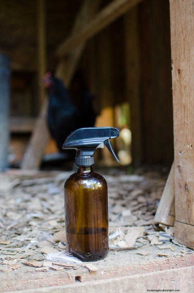 Shake the bottle well before each spray. Spray directly on the skin of the chicken, concentrating only on the neck, the vent area, and the top of the tail where the oil gland is. I also spray their feet and the roosting bar base so that when they lay back down on their feet and roost, the mixture gets onto their bellies. Do this treatment at night after they’ve gone to roost.