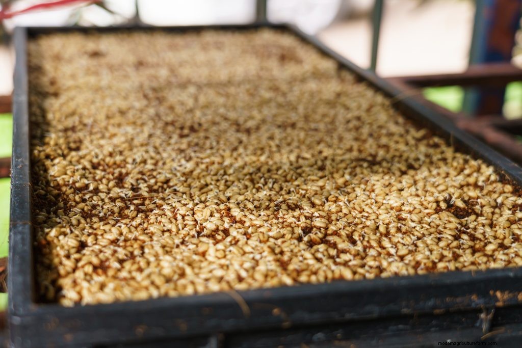 For maximum sprouting, it’s recommended that you soak your grains for a full 12 hours to help soften the outer shell. After that, the seeds should be thoroughly watered at least twice a day. For growing in small containers, you can simply fill with water and rinse the seeds through a strainer. After a few days when a solid root mat has formed, the container can simply be tipped to remove excess water. For larger seedbeds, it will be necessary to drill multiple small holes in the bottom and place them in an area where they can drain on their own.