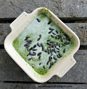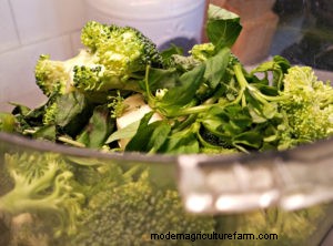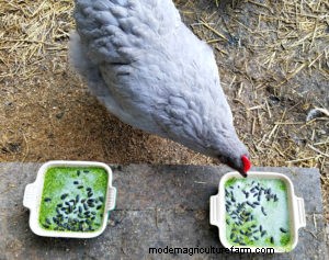 Puree the fresh herbs, weeds and/or veggies in a food processor, adding water (or vegetable cooking water) until the consistency is soupy. Offer free-choice to your molting chickens in a bowl, garnished with some black oil sunflower seeds, if desired. They’re a wonderful source of protein as well!