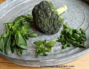 These protein-packed veggies, weeds, and herbs pureed into a smoothie will help molting chickens. Choose as many sources of plant protein from the following list as you have available. I like to harvest all of my herbs from my raised bed herb garden just before the first frost, drying some to add to my chicken’s feed through the winter and making smoothies out of the remaining fresh herbs!